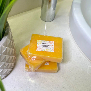 Our lemon turmeric & kojic acid brightening soap promotes brighter, more even-toned, healthier skin with its unique blend of active components.